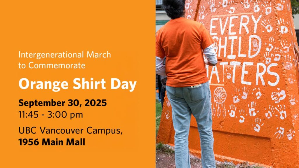 Join us for an Intergenerational March to commemorate Orange Shirt Day (OSD). The Faculties of Land and Food Systems and Forestry are honoured to host this event. This is one way the Faculties demonstrate their commitment to the UBC Indigenous Strategic Plan. Members of the UBC community, families and those in solidarity are welcome to participate. The March is intergenerational, and aims to be educational and supportive to the Indigenous community on campus and beyond. Educational activities will allow younger participants to connect with the original inhabitants of the land and plant a seed to continue these conversations about a difficult era in Canadian history at home.
