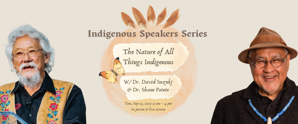 Register for our second in-person Indigenous Speakers Series session on Tuesday, September 23rd, 2025, from 9:00 am to 4:00 pm (PT) at the Robert H. Lee Alumni Centre on UBC Vancouver campus. In this event, we are excited and honoured to welcome Dr. David Suzuki and Dr. Shane Pointe, who will share their perspectives and experiences on our changing climate. In this era of truth-telling and reckoning with the past, we need one another to spark an urgent call for change—to reset our relationship with Mother Earth and the sacred, finite resources we all share.