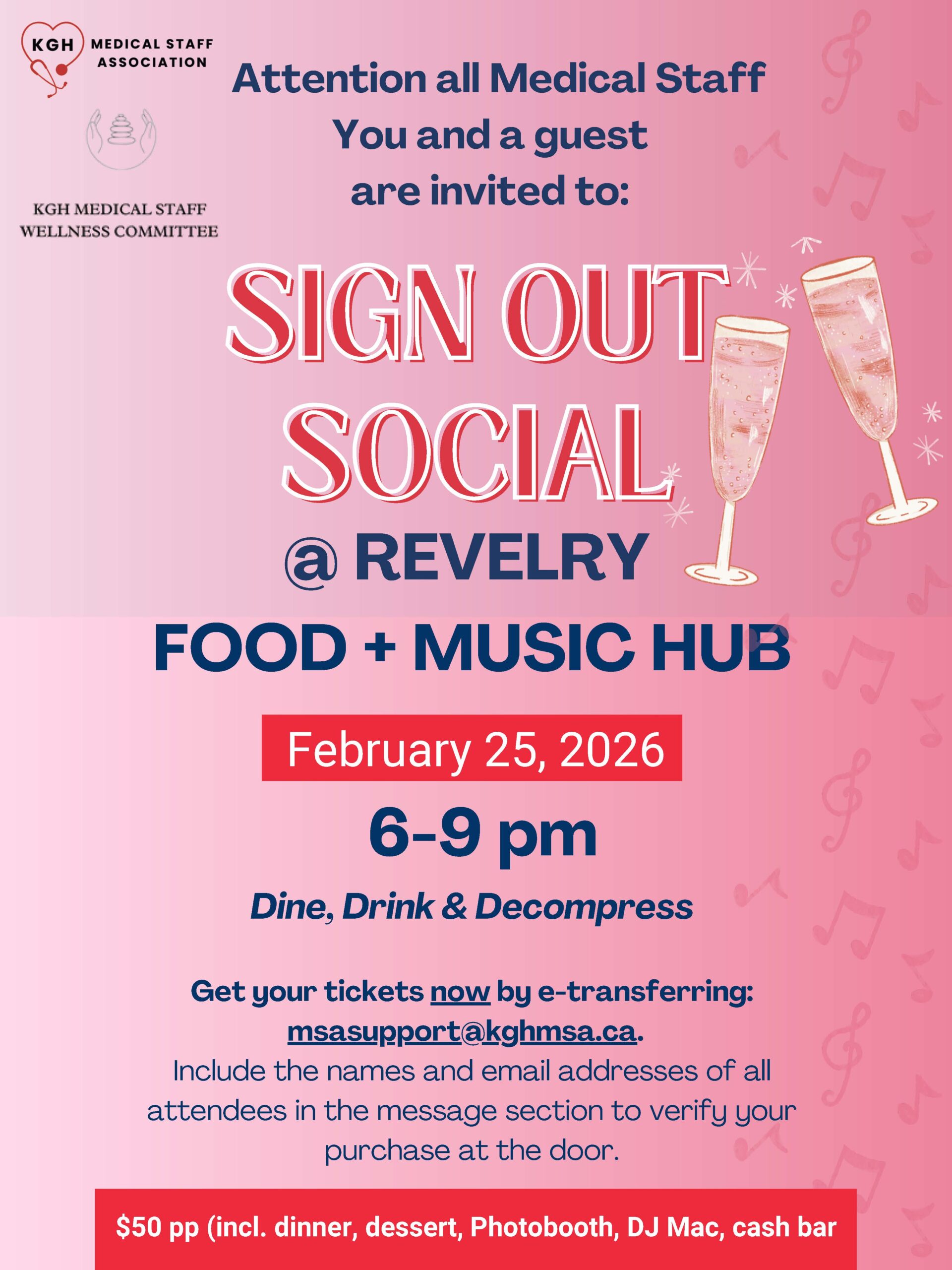 February 25 @ 6:00 pm - 9:00 pm KGH MSA Sign Out Social KGH MSA Social Event for all medical staff. RSVP Now Free